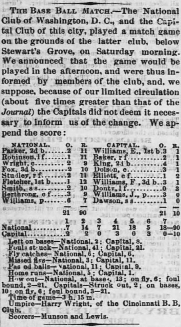 A year later, when the Nationals of Washington, D. C. made a western tour, facing the best clubs in each city, the first stop was in Columbus, Ohio to face the Capitol Club of Columbus. Among the District greats to appear for the Nationals were George Wright, who caught, as well as (MightyCaseyBaseball.com favorites) Henry Berthrong (CF) and Seymour Studley (RF). The umpire was Harry Wright, brother of George. Jimmie Williams went to the mound and proceeded to give up 90 runs to a professional nine in seven innings – the game ending after 21 outs were recorded on each side. Columbus managed but 10 runs in the game.