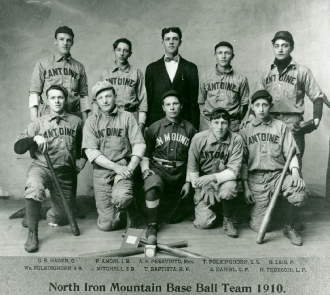4) When not playing baseball, like his father and brother, Nello was a miner in Iron Mountain, Michigan. For a period of time, he also worked in a lumber mill. He was playing semi-pro baseball by 1910. Here’s Nello (front row, far right) with teammates in 1910.