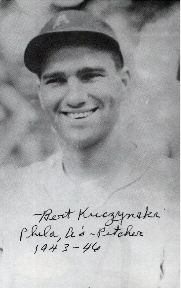 Bert was drafted in the 19th round of the 1943 NFL Draft, as well as signed to a contract to pitch for Connie Mack and the Philadelphia Athletics. With the United States at war, there were opportunities for young kids to play sports before they were drafted, and Kuczynski would pitch briefly for Philadelphia and play tight end for the Detroit Lions in 1943 – making him among the first to play both major league sports in the same season. Initially, an injured knee kept him out of the military, but after the football season, Kuczynski enlisted and served in the navy in administrative roles across the country while also playing baseball and football on camp squads. When the war ended, he played one more season in the NFL with the Philadelphia Eagles (his only catch that year was a 9-yard touchdown pass) and some minor league baseball, after which he put his education degrees to work.