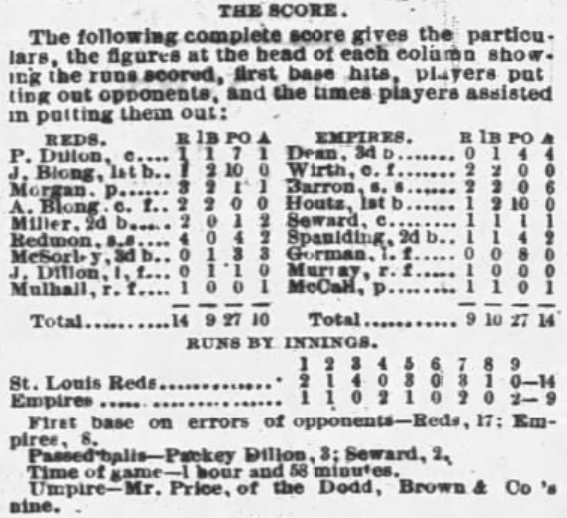 That said, I’ve found Morgan and many of his 1875 teammates playing together on the top St. Louis amateur and semi-professional teams in earlier newspapers. Here’s one from the St. Louis Globe-Democrat from July 20, 1874. Fans of the day would recognize many of the players on the Reds roster (Packy Dillon, Joe Blong, Trick McSorley, Billy Redmond for example) and perhaps a couple of the Empires. That Reds squad is the one that joined the National Association.