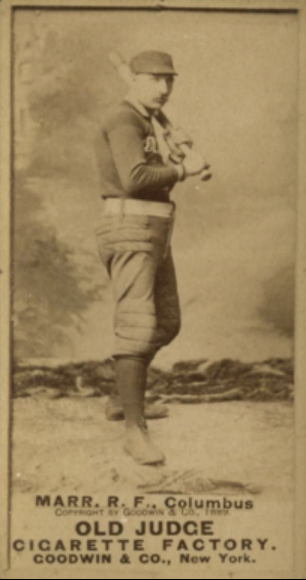 Lefty Marr was a Cincinnati born outfielder and third baseman (and later a first baseman) who had a brief run as a competent major leaguer in the late 1880s. Marr first found fame hitting .306 with 15 triples for Columbus in the American Association in 1889. He nearly repeated that season in 1890 for Cincinnati in the National League, but his career in the top leagues ended the following season. In 1891 his power and batting average fell off when the Players League collapsed and the best players were merged back into the National League and American Association. In fact, Marr played for a Cincinnati club in both leagues that year.
