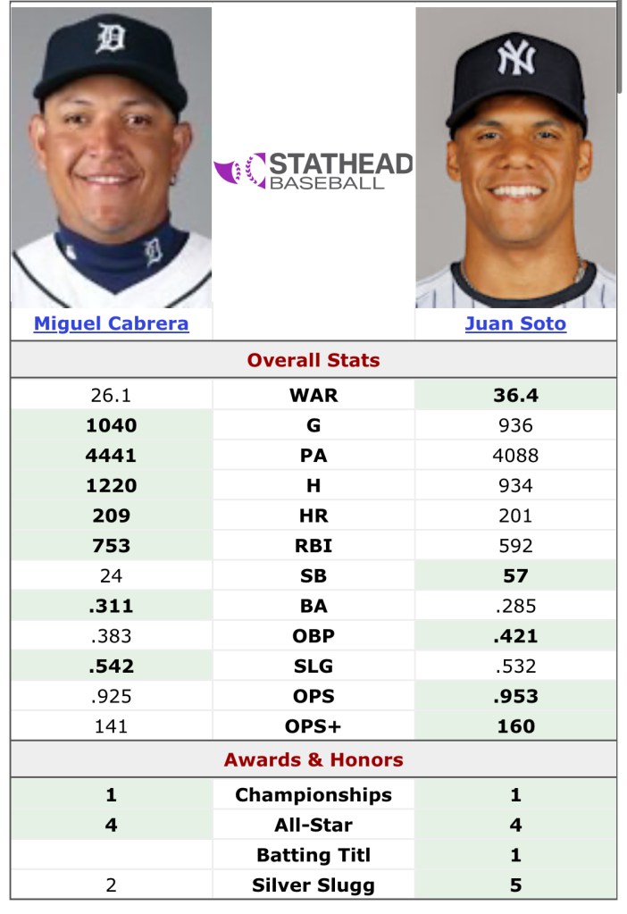 So who was the last Juan Soto type? As a south Floridan these days, the answer to me was Miguel Cabrera. Here’s a comparison of the two thanks to our friends at Baseball-Reference.com.