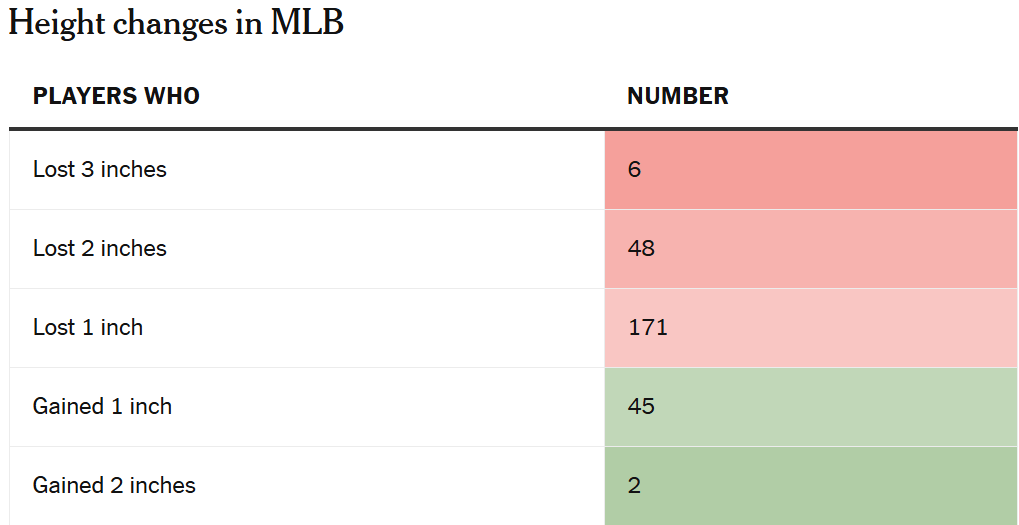 If you have been keeping up, the ABS system that will be used to define the strike zone for video reviews defines the strike zone more specifically than “…midpoint of a batter’s shoulders and the top of his pants to a point below the kneecap…” The top end of the strike zone is 53.5% of a player’s height; the bottom is 27% of a player’s height. Which, of course, means that systems need to know the actual height of these ballplayers.