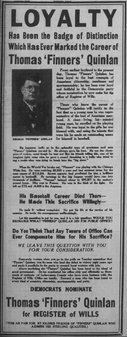 With World War I looming, Quinlan took a position at a munitions plant in Scranton for 1918, but his draft number was called; in July 1918 Quinlan joined the US Army. After completing training, he was dispatched to Europe as a private in Company K of the 28th Infantry and saw battle in France’s Argonne Forest. The war was nearly over – literally two days from the date the armistice was signed – when Quinlan took part in attacking a German machine gun nest. However, he was hit by enemy fire and shrapnel, costing him his left eye and his left arm. After his recovery at Walter Reed Hospital, Quinlan returned home to Scranton and got involved in the local Democratic political machine, serving as a city and county commissioner and in other civic positions for most of the rest of his life.