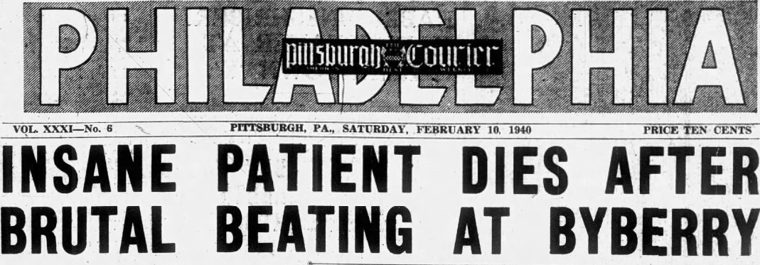“Insane Patient Dies After Brutal Beating at Byberry,” Pittsburgh Courier, February 10, 1940: 1, 4.