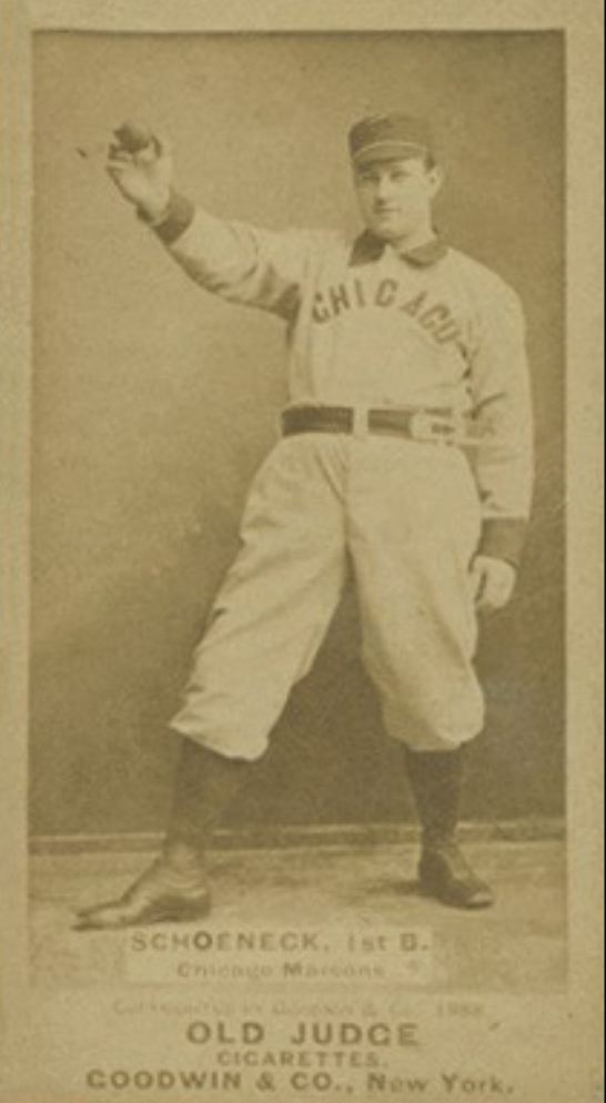 “It is likely that Schoeneck, the ‘Jumbo’ of the Baltimore Unions, will hold down the first bag. Schoeneck’s playing in the last four games seen on the local grounds, won him many admirers here, while his record is the best in the association.”