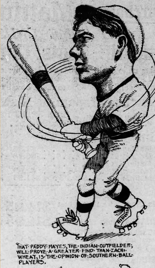 “Paddy Mayes, the Irish-Indian, sent by the Phillies to Mobile, did not last long there. Mayes has now been with Galveston, Austin, and Mobile since Fogel bought him from Shreveport. It is said he keeps his carpet bag packed waiting his next assignment.”